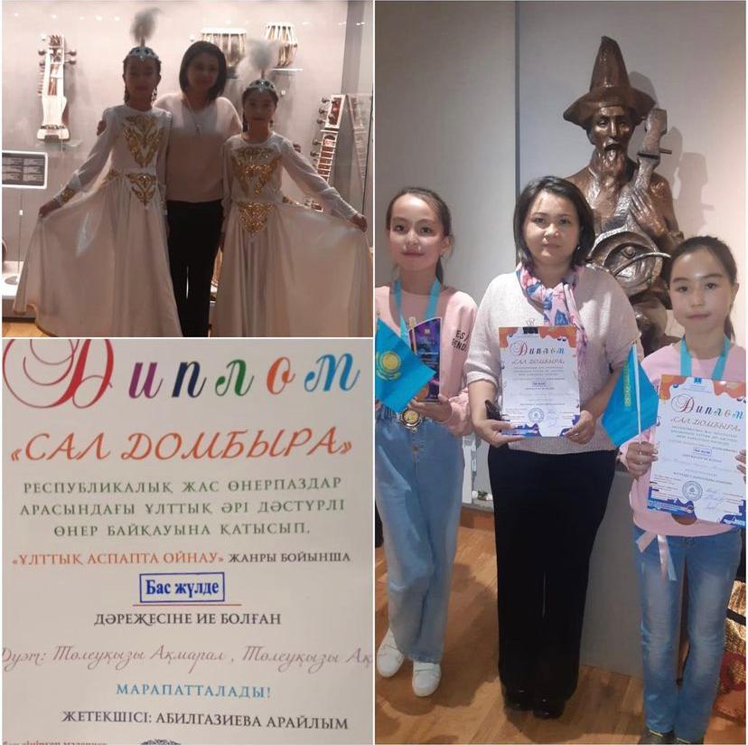 “Сал Домбыра” Республикалық жас өнерпаздар арасындағы ұлттық әрі дәстүрлі өнер байқауына қатысып, “Ұлттық аспапта ойнау” жанры бойынша БАС ЖҮЛДЕ дәрежесіне ие болған “№5 орта мектеп” МКМ оқушылары Төлеуқызы Ақмарал және Төлеуқызы Ақниет марапатталады