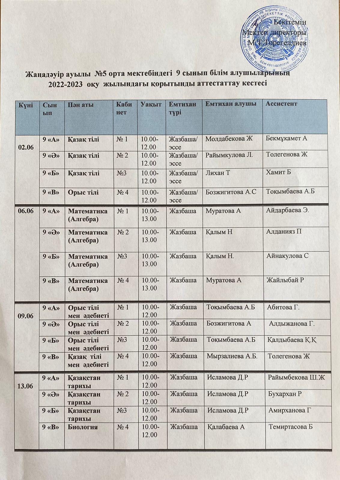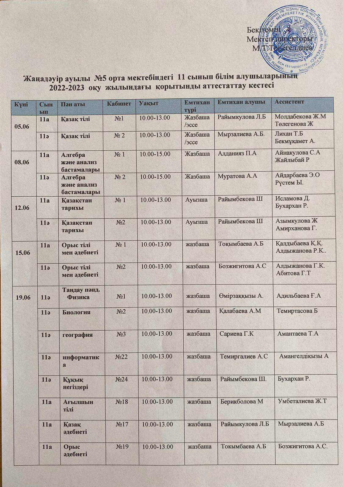 №5 орта мектебіндегі 9-11 сынып білім алушыларының 2022-2023 оқу жылындағы қорытынды аттестаттау кестесі