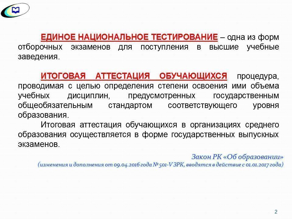 ҰБТ – ның жаңа форматы мектеп бітірушілер үшін Қорытынды аттестаттау (ҚА) және жоғары оқу орындарына түсушілер үшін Ұлттық бірыңғай тестілеу (ҰБТ) болып бөлінуімен ерекшеленеді.