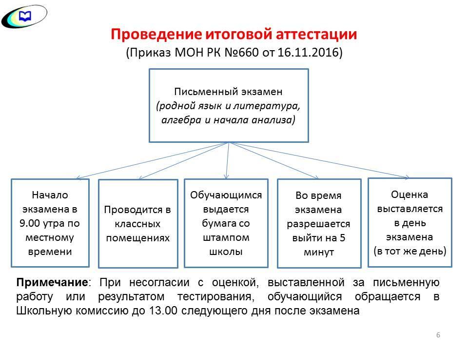 Қорытынды аттестаттау - мектеп түлектері 4 міндетті,  1 таңдау пәнінен тұратын, жалпы орта білім берудің міндетті мемлекеттік бітіру емтихандарын тапсырады.