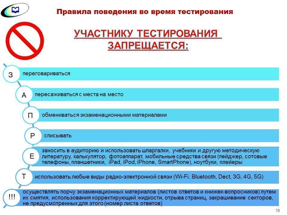 Тестіленушіге дәлелді себеппен (әжетханаға, медициналық бөлмеге) шығуға тек уәкілетті тұлғаның алып жүруімен тестілеудің бірінші сағатынан кейін 1 сағат 30 минут ішінде рұқсат етіледі. Осыдан кейін тестілеу аяқталғанша аудиториядан шығуға рұқсат етілмейді.