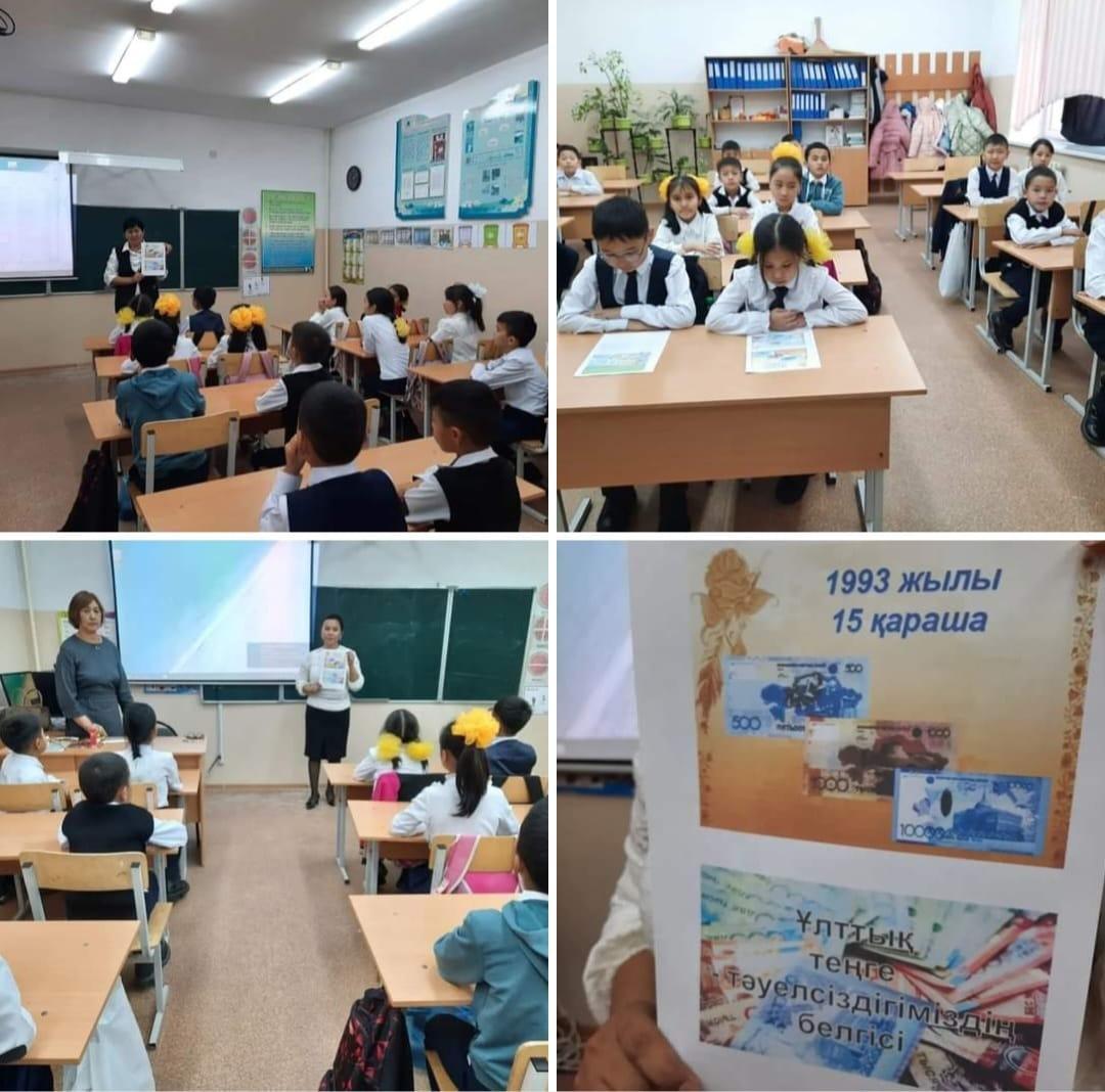Информация сағатында Тәуелсіз еліміздің ең бірінші айрықша белгісі теңгемен тереңірек таныстыра отырып, Қазақстанның ұлттық ақшаның пайда болу тарихы, өз ұлттық теңгеміздің айналымға кіруі, қалай, кімдер жасағаны туралы мағлұмат берілді.